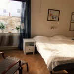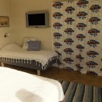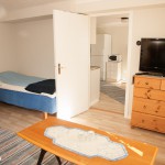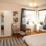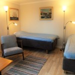 Tre sängar 105, 90 och 90 cm breda med resårmadrasser. Kudde och täcke finns, men ni tar med egna lakan. I rummet finns också sängbord, förvaringsskåp och fåtölj.