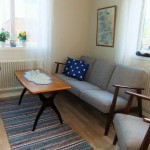 Två 90 cm breda sängar med resårmadrasser. Kudde och täcke finns, men ni tar med egna lakan. Soffa, fåtölj, soffbord, byrå och TV. Spjälsäng och barnstol finns att låna.