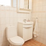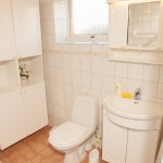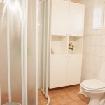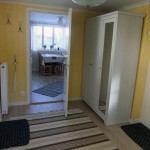 Klädskåp och städskrubb med städmaterial. Ingången till dusch och toalett från hallen. Dynor till utemöblerna och filtar till axlarna.